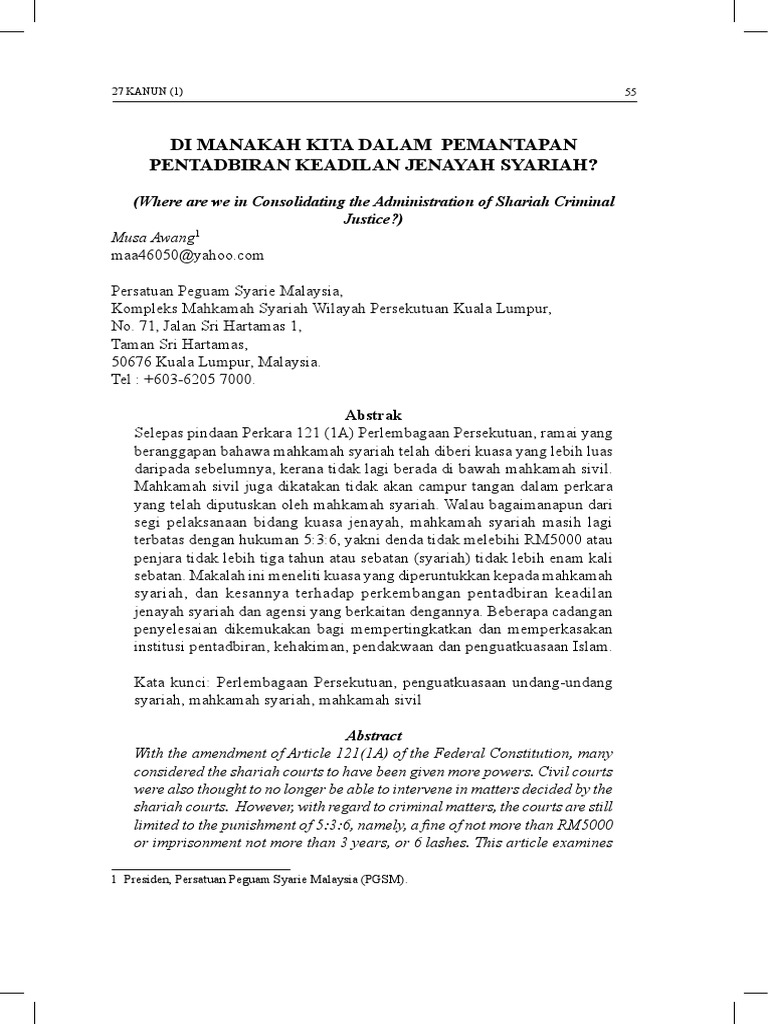 Doc Transformation Of The Syariah Court In Malaysia Reassessing Sentences In Syariah Criminal Offences Transformasi Mahkamah Syariah Di Malaysia Keperluan Kajian Semula Terhadap Bentuk Hukuman Bagi Kes Kes Jenayah Syariah Jasri Jamal