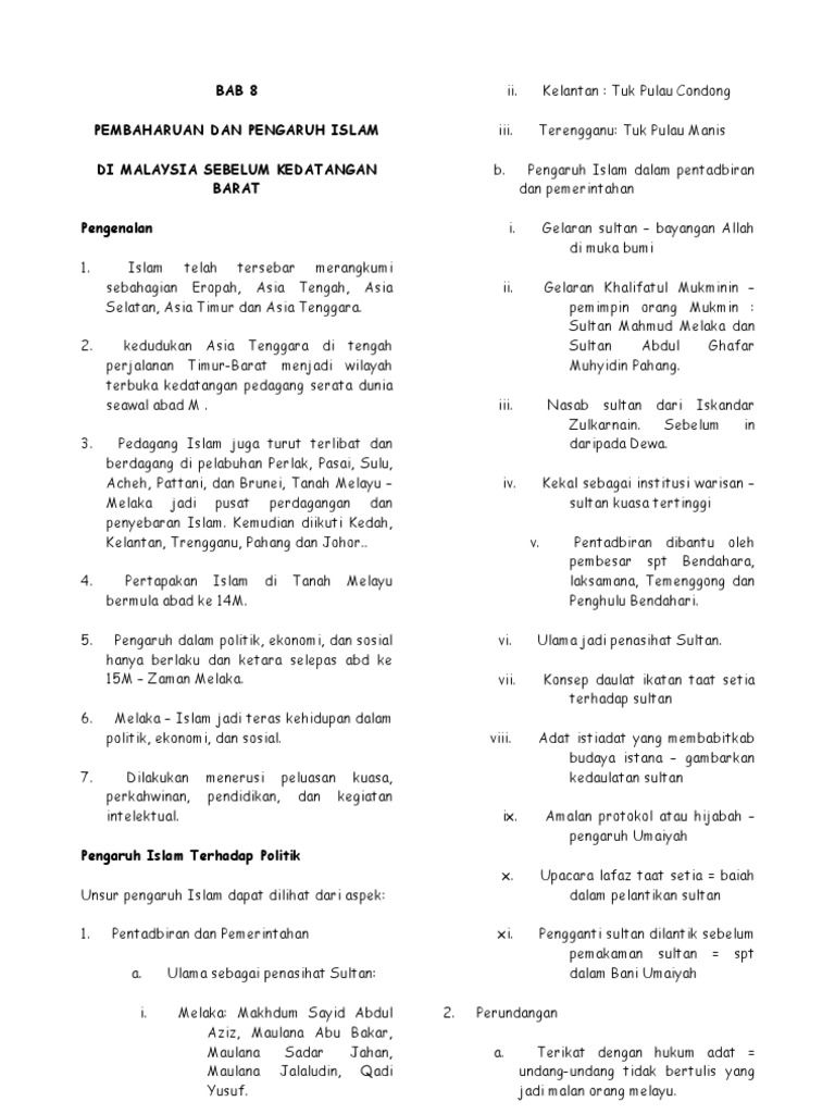 Sejarah Bab 8 Pembaharuan Dan Pengaruh Islam Di Malaysia Sebelum Kedatangan Barat Sosio Eco By Cik Pera