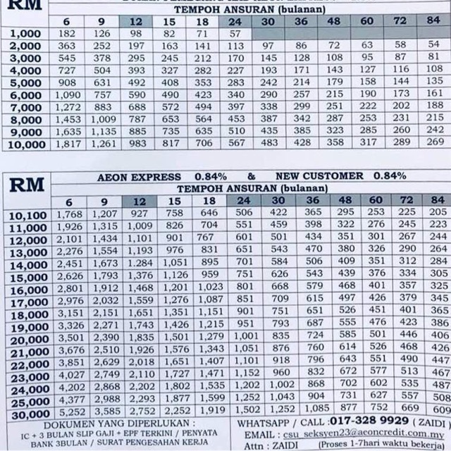 Jadual Pembayaran Pinjaman Peribadi Aeon Credit 2016